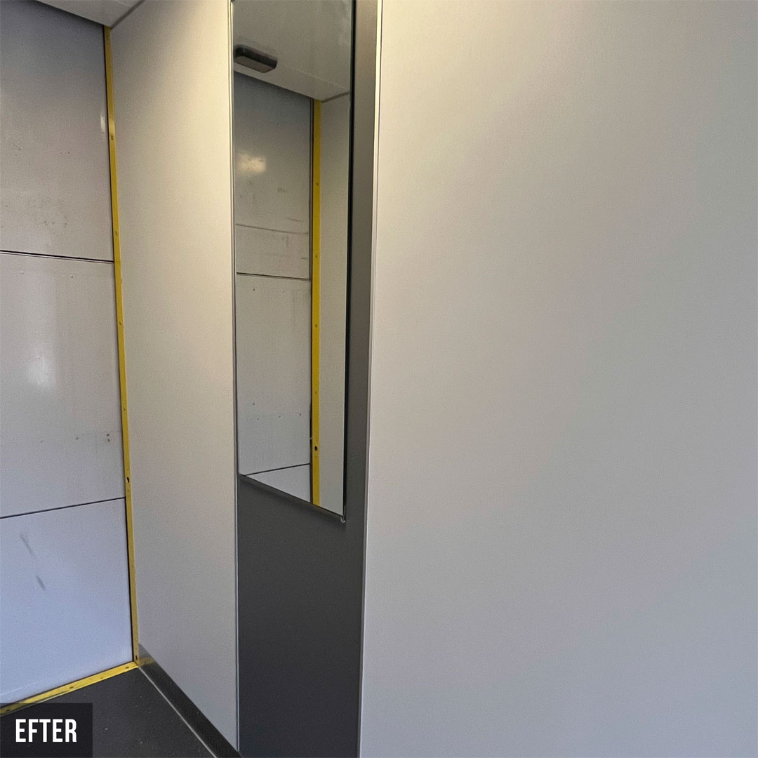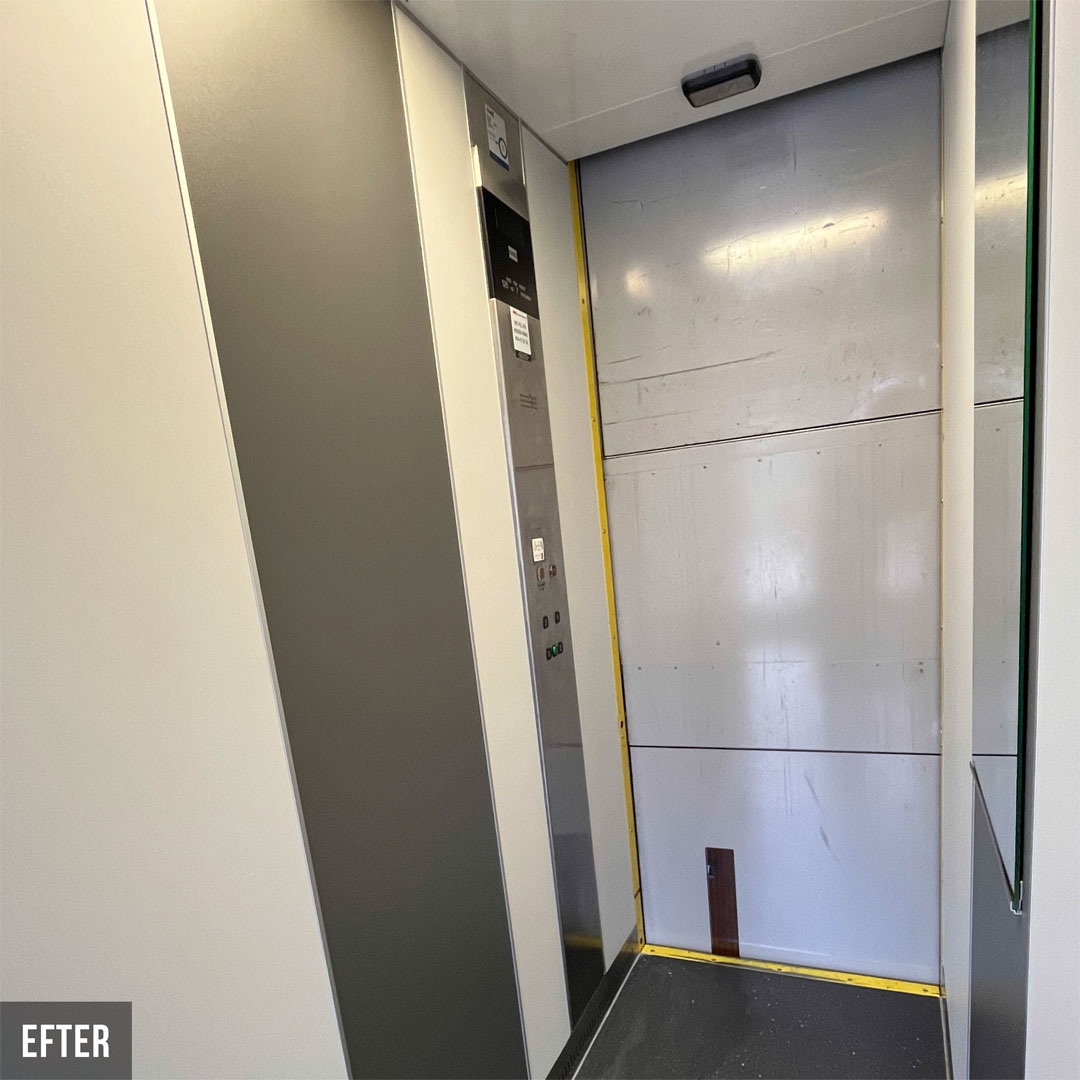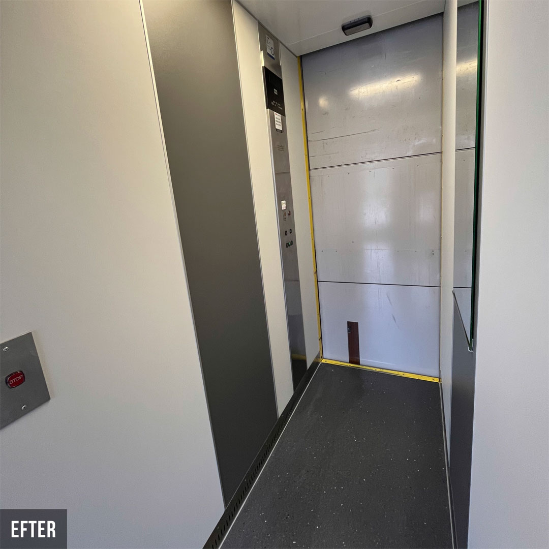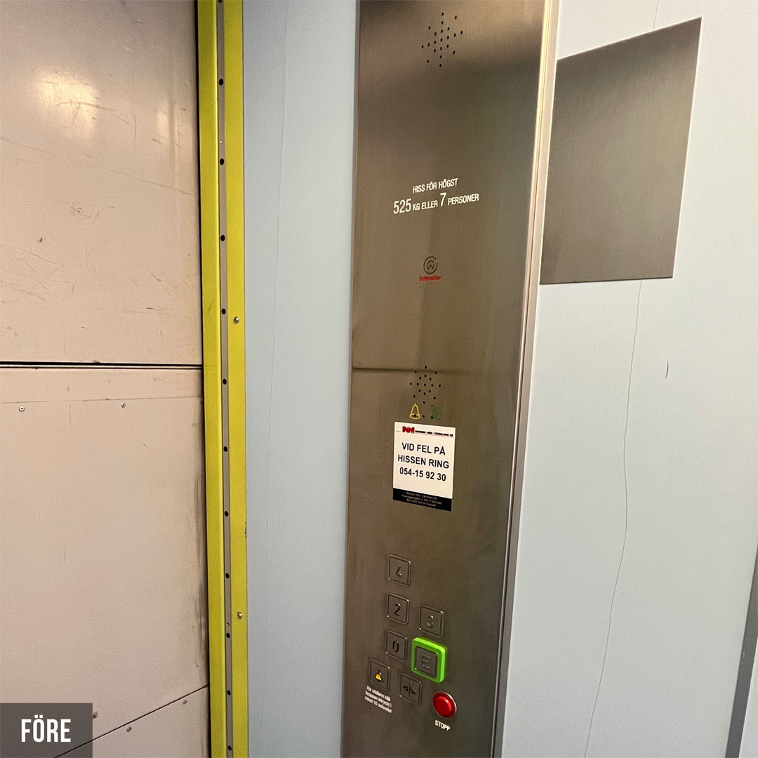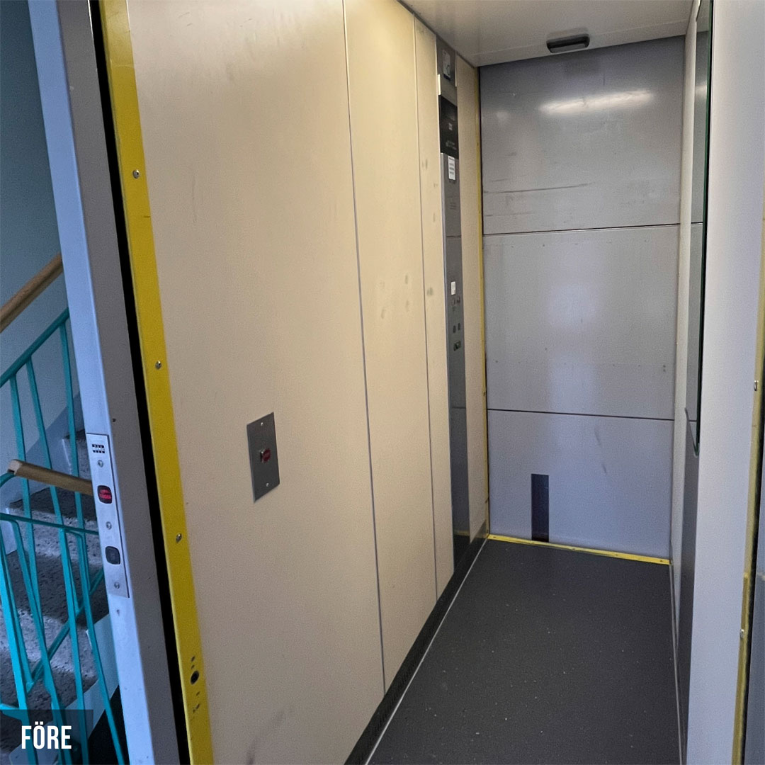 Renovering i 18 heiser for borettslag i Karlstad. De nye heisene er nå tofarget og veggene er dekket med innvendig folie Grey Velvet K5 og Grey K6. Renoveringen har hevet standarden i heisene og skapt et attraktivt miljø for både beboere og besøkende.