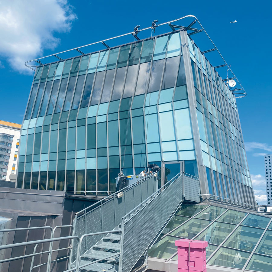 Montering av solfilm i fasadekurv for et ledende eiendomsselskap i Stockholm. Solfilm Titane 20 EXT er effektiv mot varme og reduserer opptil 73% av solens strålevarme. Prosjektet på Friends Arena i Solna omfattet 45 store glass.