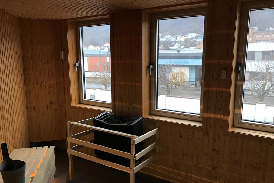 På Friskis & Svettis i Huskvarna har vi montert solfilm Silver 285 XC som personvern i badstuen. Bildet er tatt med solfilmen montert på glasset.