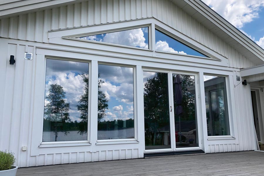Solfilm Chrome 245 XC er en film som mange velger å få montert i sitt private hjem. På dagtid gir filmen effektiv personvern samtidig som den slipper gjennom mye av dagslyset og gir eiendommen et moderne utseende. Her har vi montert 7 glass på en privat villa i Nässjö.
