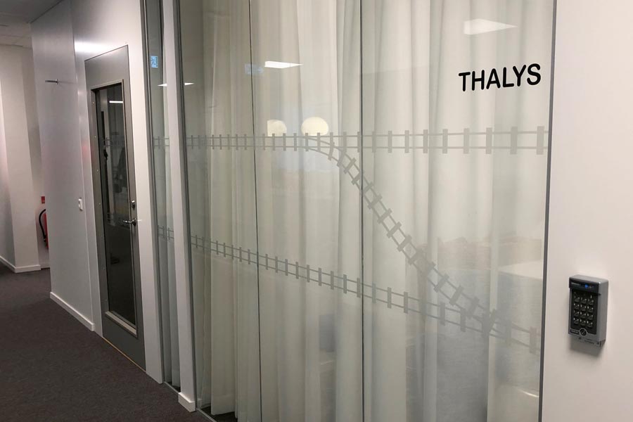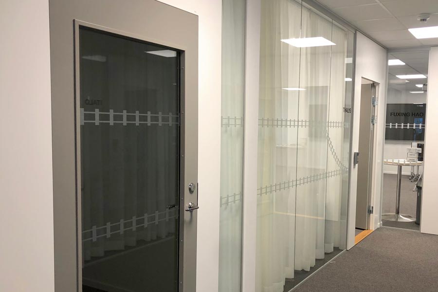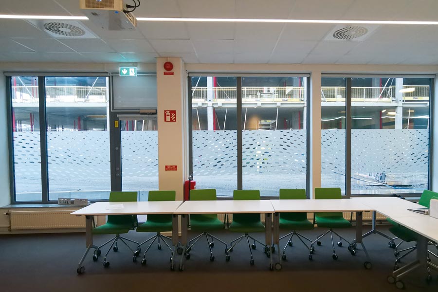 Til Trafikverket i Göteborg monterte vi frostet dekorativ film i Trafikverkets mønster, kontrastmarkeringer som togskinner og navn på konferanserom.