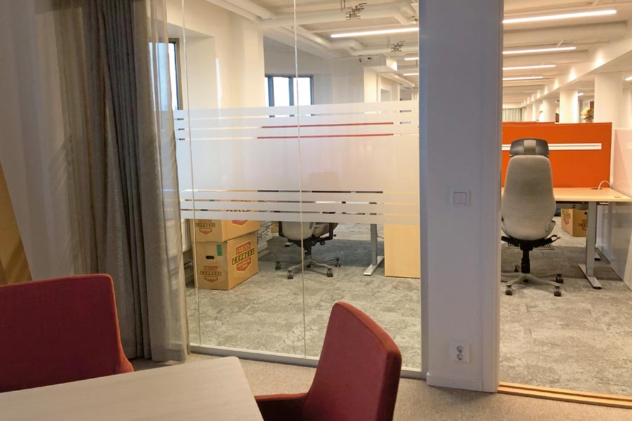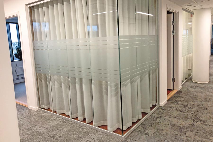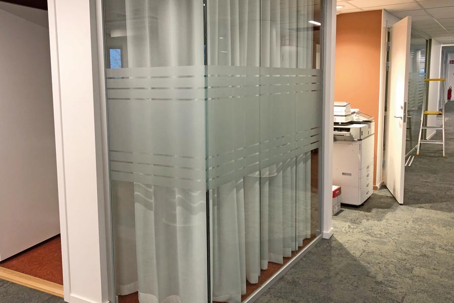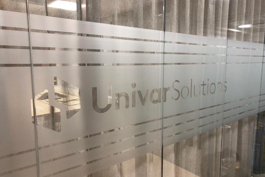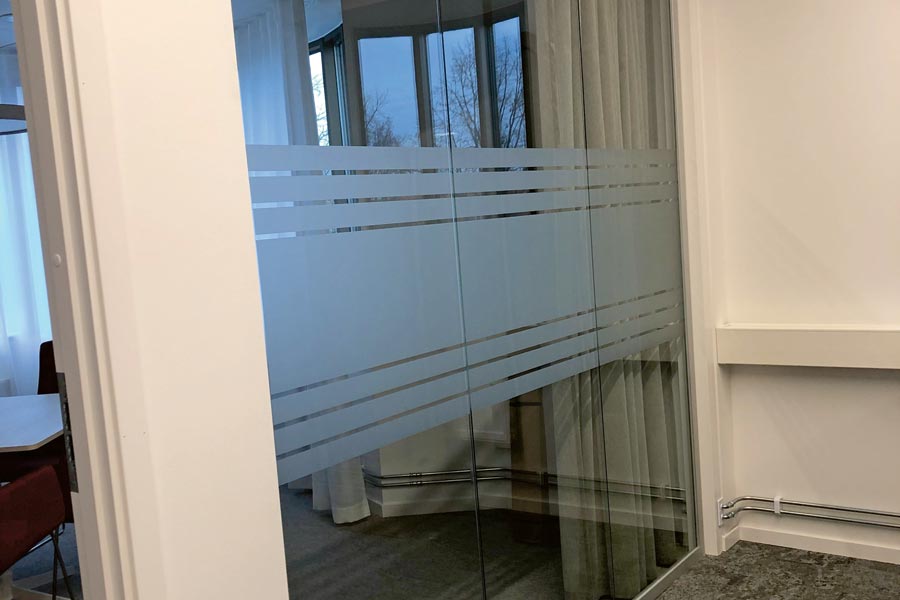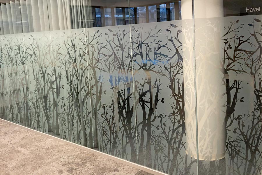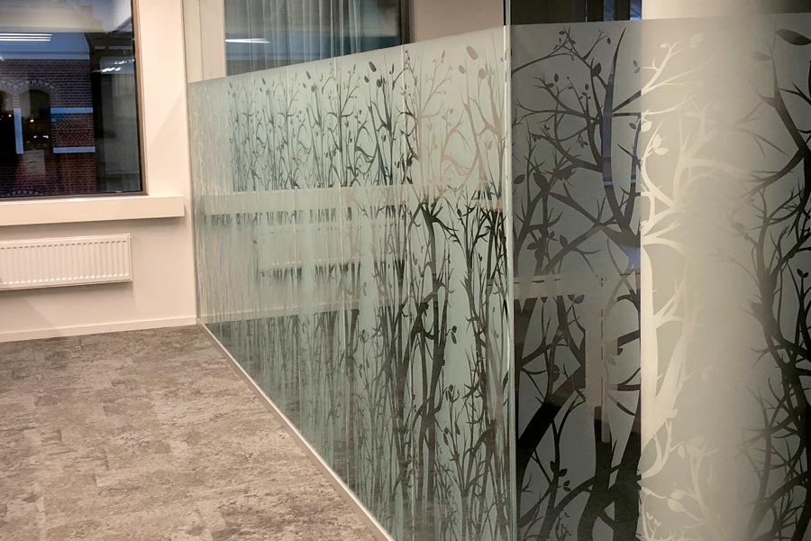 Frostet dekorativ film Mat Acid-X med utklippet eget design og designfilmen Floral.
