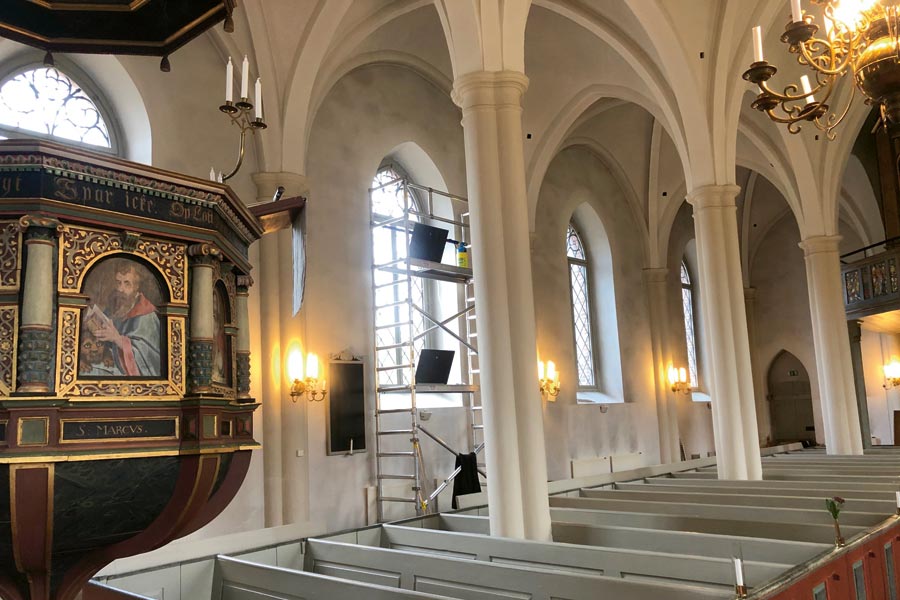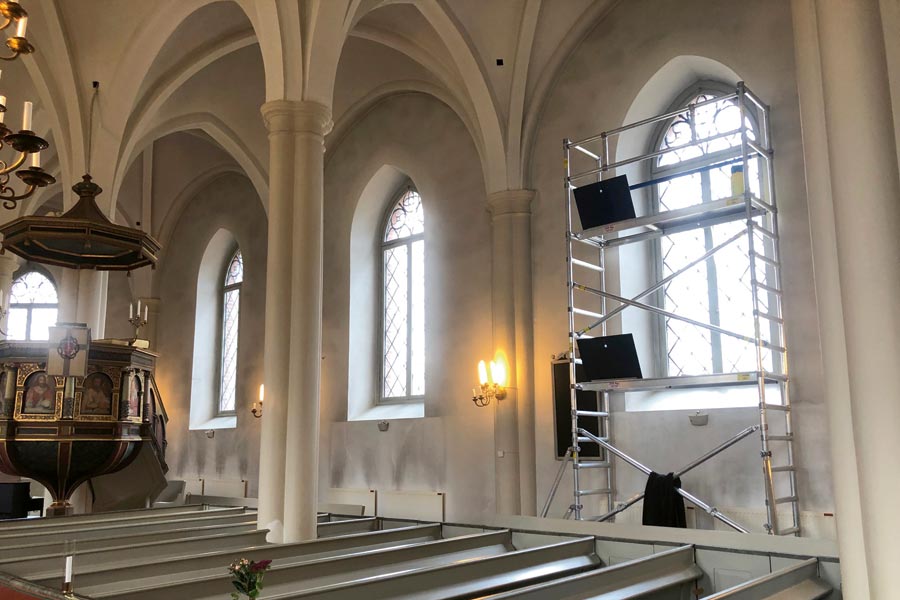 Solfilm til Vedby kirke fra 1860-tallet – 18 glass med solfilmen Silver 50 C for å beskytte benker, møbler og tekstiler mot falming.