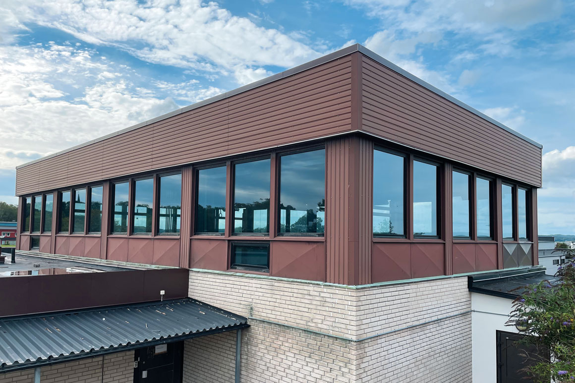 Solskyddsfilm Prisma 75 EXT mot värme i skolans idrottshall ”Sockerbiten”. Projektet omfattade 20 glas.